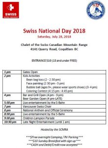 The 2018 Swiss National Day celebrations (“August 1st”) will be held on Saturday, July 28, at the Mountain Range Chalet at 4141 Quarry Road in Coquitlam. The gates will open at 1 pm. Entrance is $10 per person, everybody under 18 is free.
