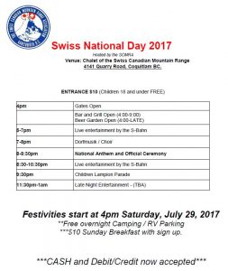 The Swiss National Day (“August 1st celebrations”) will be held on Saturday, July 29, at the Mountain Range Chalet at 4141 Quarry Road in Coquitlam, starting at 4pm. Please find attached the program for more information.